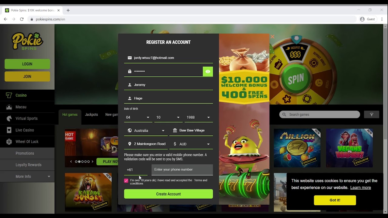 Registering at Pokie Spins Casino is a quick and easy process that allows players to access a wide variety of exciting casino games and exclusive promotions. To create an account, follow the steps below: